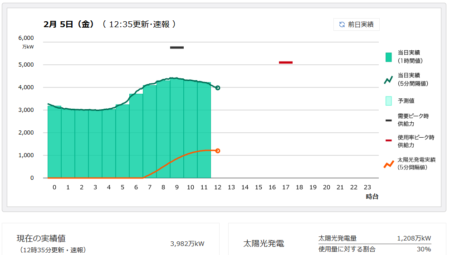 いわゆる「マイクロ・スマートグリッド」(エネルギーの自足自給)ですね。太陽光発電や風力発電で作る不安定な電力も、もう少し大きな規模のスマートグリッドで柔軟に対応出来ることだろう。それでも太陽光や風力発電の容量を増やしていくと、余る。上は2月5日の東京電力の電力バランス。何と12時35分時点では30%が太陽光発電から供給されている。