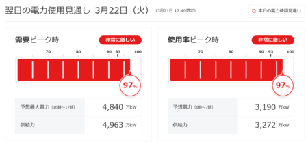 参考までに書いておくと、悪天候で寒かった1月6日は東京電力が5421万kWという供給体制を取った。そして5300万kWくらいの需要あったと記憶している。東京電力だけじゃ足りず、北海道や東北電力から融通を受けた。3月22日が1月6日くらい冷え込んで天気悪くなると、供給能力を超える可能性出てくる。もちろん企業には節電要請していると思う。