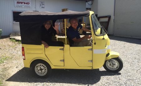 ということで早速問い合わせ中。ちなみに3輪モデルの方が個人的にはカッコ良いと思うし、価格なんかさらに安い8万円程度! 当然ながら品質的にはヒジョウに厳しいと思うけれど、2年くらい使えればモトが取れそう。下はサンコーワークスのマスコットになってる150ccのオートリクシャ。軽2輪登録(白ナンバー)のため高速道路も走れます。走りたくないですが。
