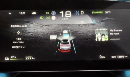 ADASは若干粗っぽい制御ながら(中国と同じレベルのADASは輸出出来ない?)、周辺表示を見ると2台前のクルマまで出てくる。レーダーは股抜き制御しているということ。日本の場合、自動運転より安全確保という点でドライバーのミスを防いでくれるADASは重要。もう少し進化させることで中国車のキラーコンテンツになるかもしれない。