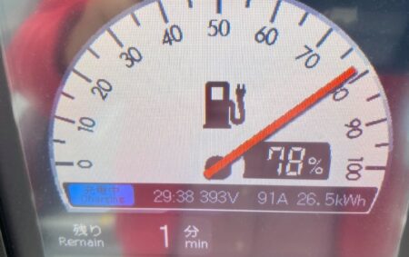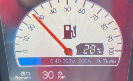 最近日産のディーラーを中心に導入が始まった高性能急速充電器は72.6kWという早さだった(上の数字)。最初から最後までこの速度をキープ出来れば30分で36kWh(約230km走れる)という電力を供給可能。現在の電池だと受け入れ側の制限で徐々に充電能力を落としてしまうが(29分後は36kW)、現在でも180km走れるだけの電力を貯められます。倍の早さになれば360km。