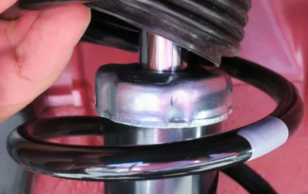 次に出てくるのが2013年のオデッセイ。こちらは乗り心地酷評! 実際、酷かった。特にリアの突き上げ感ときたらハンパなし! しかも錆の攻撃を食らう。上はオデッセイの韓国ザックス。ダストカバーを取ったらこんなんだったそうな。新品を見ると下のような金属肌。防錆処置もヘチマもない生金属です。こらタワシ頭みたいになって当然かと。とうていザックスの品質と思えぬ。