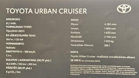 とはいえ情報が少ない、と思っていたら、フィンランドのラリー会場に展示してありました。デザインは写真の通り。フロントもリアクォーターもスズキのイメージ皆無。完全なトヨタ車である。なかなかカッコ良いです。スペックも写真の通り。全長4285mm×全幅1800mm。ヤリスクロスより少し幅広。WR-Vに近い。欧州だとBセグメントということになる。生産工場はeビターラと同じインド。BYD製のLFP電池を使う。