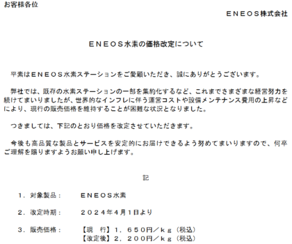 ENEOS、燃料電池車の普及に急ブレーキを踏む! 現在の1650円の水素価格を2200円に値上げ!