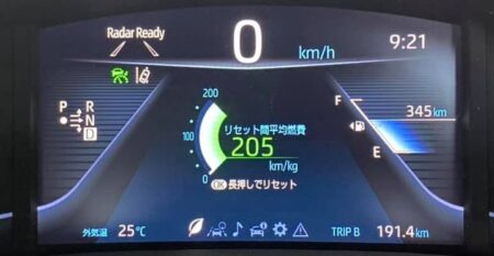 早速MIRAIの”頑張って走った燃費”をチェックしてみました。コースはGo&Stopがあまりなく、しかも65km/h以下で走れる首都高ですね。下の燃費の条件は65km/h以下。エアコンオフ。流れはまぁまぁ良い感じ。距離は約40km。このまま走り続ければ水素5kgで2025km走れる計算。実際は5,3kgくらい使えるとすれば、フランスで出した1003kmに届きそうだ。