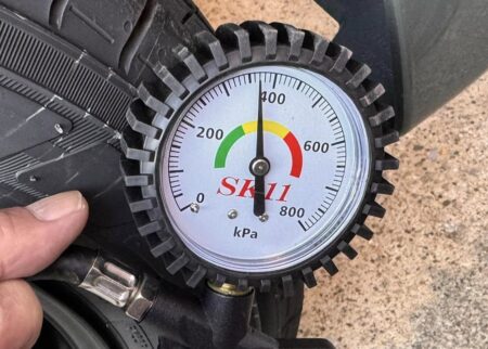 N-VAN e:、大いに気に入って乗っているのだけれど、乗り心地がカッタイ! 同じ商用バンでもハイゼットってもっと快適なのだった。そういや納車されてから空気圧をチェックしてなかったことに気づいた。確認すると左後輪が370kPa。右後輪390kPa。標準は300kg積載時で350kPa。ということで300kgなんか積まないから後輪も前輪の指定と同じ300kPaにしてみた。