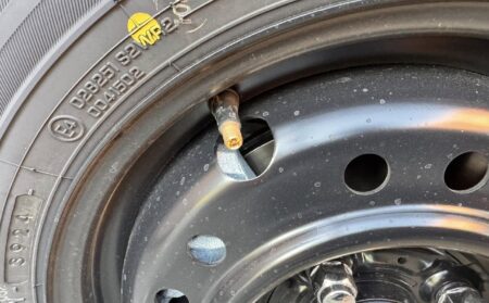 仕方なくホイールを外すことに。外出先じゃなくてよかった! もしかしたらN-VANもそうかもしれないが、空気圧チェックの時はバルブの位置に気を付けること。いずれしろテッチンだとカッコ悪いので標準タイヤでの電費データ取れたらホイール&タイヤ交換するつもり。軽自動車、ホイールもタイヤも安い! 14インチホイールなんか7000円程度ですから。