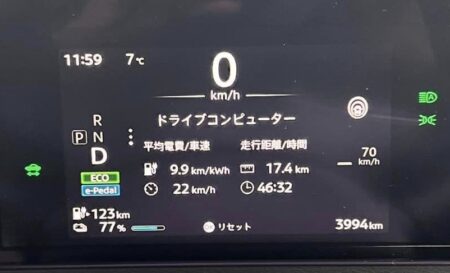 横乗りのディーラーのお姉ちゃんが「全開にしてみてください、モーターの加速は凄いですよ」っていうもんだからアクセルガンガン踏んで乗りました。皆さんそういう乗り方をしていたみたいでエアコン付けて電費計は7,2km/kwでした。普通に乗ればもっと良いと思います。セカンドカーユースにぴったりの車だと思います。