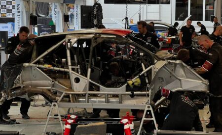 今年のシリーズチャンプ最有力候補のロバンペラはSS2でアウト側に膨らんで溝に落ち3回転くらいしてしまった。派手な損傷だったがドライバーとコ・ドラに問題無し。ラリー1車両って丈夫だ! FIAの車検委員のチェックでロールケージのゆがみなど無かったため夕方から土曜日に向け修復を開始。外側パネルを外すとこんな構造になっていた。初めて見ました。