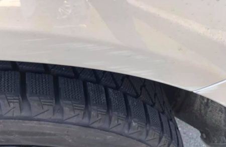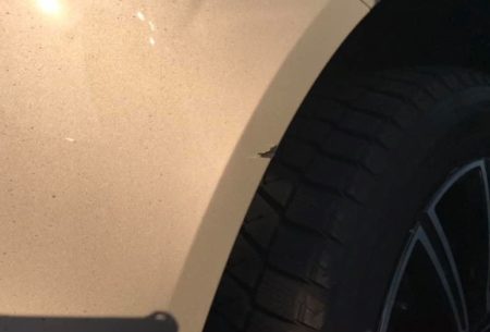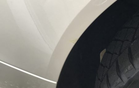 板金が必要なほどのダメージなら仕方ないけれど、この程度なら目立たない程度に補修しておき、本格的にブツけたらその時に修理すればいいという。及川さんの推奨は、下地までガリッた左リアについちゃタッチペイント。下地まで行ってないが、けっこう深い傷は磨いてガラスコートです。タッチペイント「純正が入手出来なかったためとりあえず下塗りしてます」。