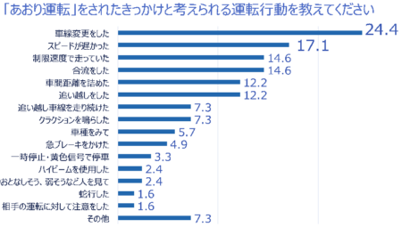 今まであおられたドライバーは自分を正当化するため、「相手が突如あおってきた」みたいなことを主張していた。チューリッヒ保険会社の調査では「あおり運転をされたきっかけと考えられる運転行動を教えてください」という項目を設けてあり、そこを見たら「あんた知っててやってたの?」と、むしろあおられたドライバーに対し、文句を言いたくなってしまう。