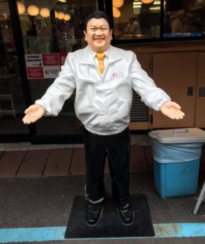 築地といえば『すしざんまい』の存在感が大きい。けっこう「マネしてる」と勘違いされるの社長さんのポーズだけれど、こうやって見るとぜ~んぜん違うと解っていただけるかと。そもそもすしざんまい社長さんのコンセプトは「いらっしゃいませ」であり、ウエルカムの具象化です。手の開きは左右均等であり、下手。決定的に違うのが足。曲がってないです。