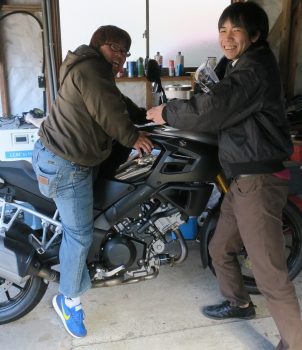 永田がムカシ「デザイナーになりたい」と言っていた山形の高校生(今や院生とのこと)を連れてきてバイクの話になった。無謀にもVストロームにまたがってみたいというのでやらせてみたのが上の図。向こう側の足はステップにも届いていない。100パー無理だなこりゃ。車道側に立ちごけしたら危険。