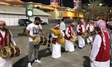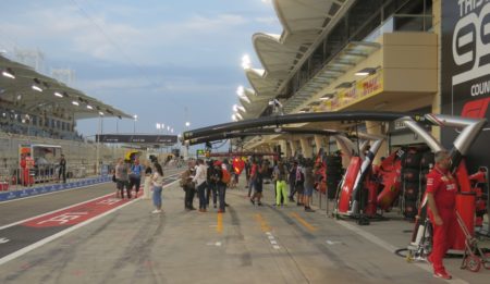 サーキットは首都マナーマから30分くらいの砂漠(というか雨の降らない岩石地帯。いわゆる土漠)の中にある。昼間熱いけれど、日が暮れる頃から素晴らしく快適な空気感になる。すると太鼓叩く人が出てきたり踊る人が出てきたりコンサートが行われたりとお祭り騒ぎ。金曜日、土曜日とスタンドの人は少ないけれど、サーキット大賑わいです。