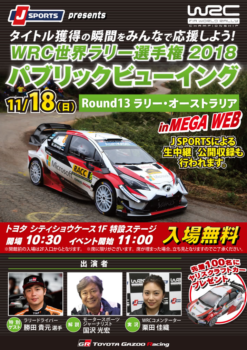 今週末は台場のMEGA WEBでWRC最終戦オーストラリアの生中継&パブリックビューイングを行います。開場は10時30分から。入場無料なのでお時間ある方はぜひ! 台場、MEGA WEBだけでなくヴィーナスフォートでの買い物や(アウトレットもあります)、歩いて5分の場所にあるダイバーシティ(ガンダム像もあります)など家族で1日遊べる。トヨタ勝ったら盛り上がります!