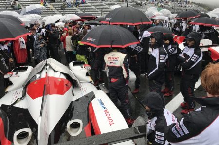 当然ながらレースはペースカー先導で始まった。妥当な対応だと思う。LMP1の最高速は300km/hを軽く超える。見えないとアブナイ。何とか安全が確保出来たという判断でレース開始! 序盤から6時間レースと思えないほど激しいポルシェとトヨタのガチバトルになる!