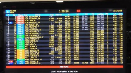 レースの方は雨の降り方や霧の発生でペースカー出たり中断したりと、コースの状況を見ながら展開。大雑把な雰囲気でトヨタが優勢である。4時間を経過したあたりで一段と視界悪くなり、こら危険でしょうと思ったらペースカー。そのまま6時間の75%となり、赤旗中断に。