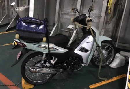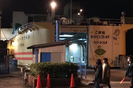 ということで19時15分発の徳島行きフェリーに乗り込む。原付バイクと人間で3600円。東京まで下道走ろうと思ったが、低気温傾向は数日続く。おそらく2時間毎に暖まらないと持たない。東京まで2~3日掛かる? ということで徳島に渡り、そこから東京行きのフェリーに乗ることにしたのだった。22時25分に徳島港着。徳島ラーメンです! 楽しい~。