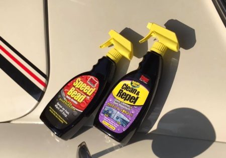ボディ面は雰囲気出すため磨き込まず、汚れを落として軽くワックス掛け。以前も紹介した『ストーナー』にハマッてます。下の左側がボディの汚れ落とし+ワックス。右は窓ガラスのクリーナー+撥水コート剤。やっぱしこの手の用品はアメリカが上手。通販で買えます。ただ単品だと送料掛かるため、モーターレブの多走行車用とエンジンクリーナーのセットがセール中。