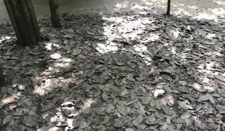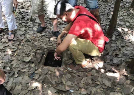 「ここですよ」と葉っぱを払うと出てきました。小さいのはアメリカ人の体格じゃ入れないようするためだという。確かに人が入れると思えない。アメリカ兵からすれば突如ベトナム兵が消える&突如ベトナム兵が出てくるといった状況になります。こんな穴が至る所に設けられているそうな。ガイドさん付いていれば入らせてくれるという。真っ暗らしい。