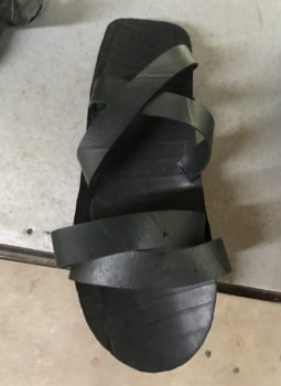 TV番組で池上さんが紹介していた「履くと前後逆の足跡付くサンダル」だ。手前にカカト。上はつま先。これで歩くと逆に進んだ足跡になる。こういった日常物資や武器などの類いは破壊したアメリカの自動車タイヤや、爆弾などの金属をリサイクルして作ってます。なるほどアメリカも精神的に厳しかったと思う。ベトナム人の知恵や工夫する能力に驚く。