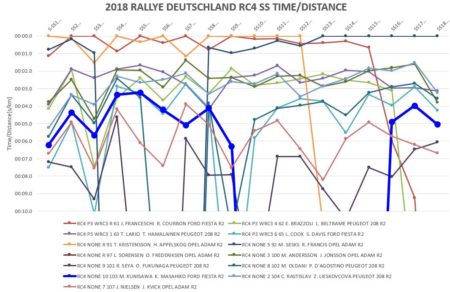 WRCドイツが終了してヒョウロンカに戻りました。さてさて。国沢光宏の腕前はどうだったのか? 解りやすいの、新城ラリーの競技長などの経歴を持つ長坂眞澄さんが作ってくれたタイム経緯。青い太線がワタシです。SS1はステージキャンセル。SS2からSS8まで普通に走れた時のタイムなのだけれど、明日のオジエ級であるダントツの2台を除けばソコソコです。
