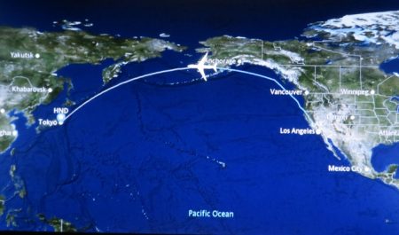帰りはデルタのB777-200。飛行ルート見たら、大圏コースの向かい風が強いんだろう。海に出ないで西海岸を北上。サンフランシスコ、シアトル、アラスカのアンカレッジ上空、アリューシャン列島、キスカやアッツという第二次世界でお馴染みの島を通るというルート。飛行時間は10時間少々です。