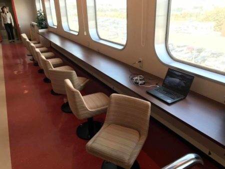 しかぁし! 素敵な仕事場所がある。このフネ、パブリックスペースを贅沢に確保してあり、窓側にコンセント付きのデスク。陸側(徳島からだと進行方向で左)に座るとけっこうな時間、携帯電話入る。ずっと仕事しなさいってことだ。幸いフネの中なのでヒマ。ラーメン屋に行くことも出来ない。覚悟を決め、2月26日売り号の原稿を書くことにします。