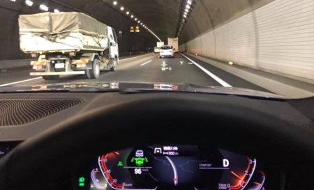 BMW以外はなぜ使わないかと言えば、静電センサーが超高価だから。新しい3シリーズはハンドルに触れていればレーンキープしてくれるから楽ちんだ。ちなみに上は新東名の120km/h区間。やっぱりトラックやバスが追い越し車線のノタノタ走っていて、120km/h巡航なんか出来ませんワな。とにかくトラックがすぐ追い越し車線に出てくる。ケンカ売ってるようなモンだ。