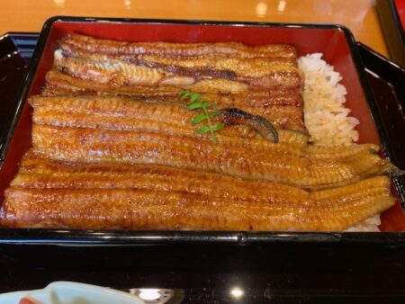 メインの鰻重はそれはそれは見事なものでした。蓋を取ると、重箱の端に少し白いご飯が見えるものの、重箱の大半を覆いつくす大きなうなぎで、しかも全く焦げ目のない見事な焼き加減です。これほど素晴らしいうなぎには滅多にお目にかかることができません。この段階で栃木一はもちろんのこと関東でも一、二を争う店ではないかと思いました。