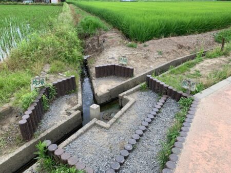 まあ行ってみると、田んぼと水路があるだけで、何の変哲もない感じでしたが、行かないことにはそんな感想も語れません。木箱の中に用意されていた記念スタンプを押して持ち帰りました。