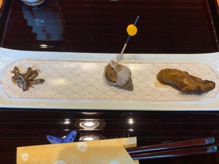 予約してあるのでうなぎを割いて串を打つところまでは準備してあるようでした。蒸して焼いては客が店に着いてから始めるため、多少の待ち時間が発生します。その間にいくつかの料理が提供されます。最初は骨煎餅で、うなぎの骨の素揚げをぽりぽりとかじります。次いで前菜として稚鮎の佃煮、つぶ貝、牡蠣の佃煮の3種盛りが提供されました。