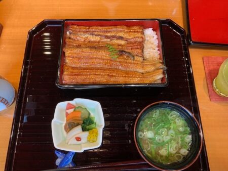 そして最後のデザートはパイナップル、グレープフルーツ、抹茶の3種類のシャーベットにシャインマスカットが添えられていました。うなぎ以外の料理ものもしっかりおいしく食べさせる店でした。これで8800円(二人分で1万7600円)でしたが、東京からわざわざ食べに行く価値が十分にある店でした。