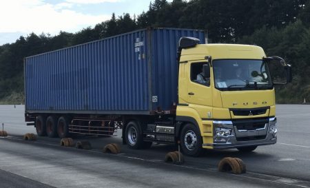 するとどうよ! 試乗メニューに直角バックが! 最大級の大物である3軸の海コン引っ張って直角バック、初めてです! 恥かくのを覚悟しダメもとでやってみたら、あらまの一発! 一番驚いたのは自分である。三菱ふそうのヘッドが乗りやすいってことでしょうね。楽しい!