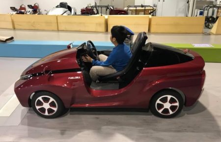 小学生になると本格的な免許取得コースがあります。こちらはウインカー出したり一時停止あったり。仮免許取って何回か乗り、一定の技量になれば写真付きの免許証くれる。有料ながら2周200円と普通のアトランクションと比べたら圧倒的にリーズナブル。お金取るのは制限のためか? ちなみに下のミライっぽいクルマ、ホンモノの燃料電池を積んでいることに驚く!