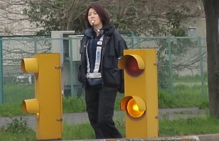 ちなみにこんなカッコでも十分役に立つ。なによりキチンと笛を吹いているから、事故防止効果だって大いに期待出来るだろう。青海一丁目の交差点、40フィートの海コン引っ張ってるトレーラーの右左折が多いため、歩行者や自転車の巻き込み事故を防ぐという意味で交通監視は有用だ。