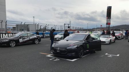 すんげ~っ! おっ立った瞬間、襟首をグイッと掴まれる感じ。思ったよりずっと短い距離で減速するのだった。ブレーキキャパの少ないECOカーには最高だ! ということで予選は2台の格段に速いテスラ・モデルSとテスラ・ロードスター、そしてトラブル起こさなければ抜群に速い86の次の5位。「これ以下だとウデに問題あるし、これ以上は誰でも難しいですね」という順位です。