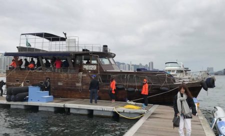 ということで話を聞いた後、午後から『インポートレース』と呼ばれる超短いレグで行われるスプリントレースを見る。用意されたフネを見てびつくりギョウテン! どう見ても60年はある木造船です! 皆さん「止めた方がいいのでは?」。こんなに大きい木造船に乗るの、生まれて初めて! もはや香港でも珍しいらしく、海に出たら周りのフネから写真撮られまくる。