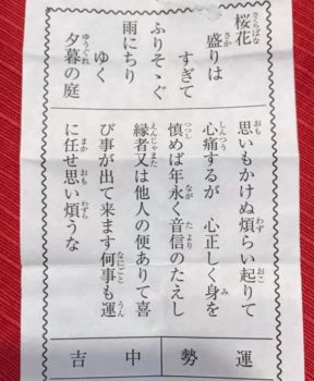 新年明けて近所の神社に初詣。恒例のおみくじを引いたらヒジョウに厳しい。「桜の盛りが過ぎ雨で散る夕暮の庭」ときました。年末から自動車メーカーのことを書いているが、調子に乗るなっていう示唆だと考えます。早速神様にたしなめられました~。ちなみに神籤は歌がメイン。吉とか凶って目安に過ぎない。教えの通り心正しく身を慎みたいと思う。