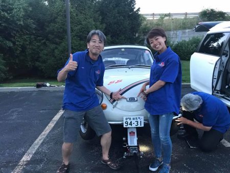 何と! 4日目も走りきってしまった! 本日は猛烈なアップダウンのある区間や、1時間も指示速度80km/hが出る(制限速度88km/hの直線道路)など、非力なスバル360にとって体力勝負のようなコースだった。今日から「リタイアしても仕方なし」という気持ちで走る。