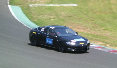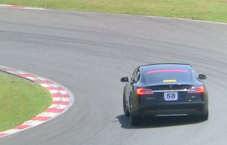 実力チェックですね。するとどうよ! フルアタックしたミライや30kWhのリーフ、そして前戦の富士スピードウェイで首の差2位となった改造ミラに届かなかった。やはり最終コーナーからの登り坂が厳しい! しかもテスラの場合、204馬力であっても連続して使用していたら、オーバーヒートでセーブモードに入る。