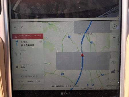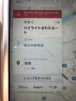 するとどうよ! 家を出て1時間もしないうち「届きません」の表示。ちなみにクルコン設定速度80km/h。電費5km/kWh。数字からすれば十分届く。不安だったためテスラダイヤルというインフォメーションに電話。なんと12分待たされる。2人くらいしかいない? しかも外国人。