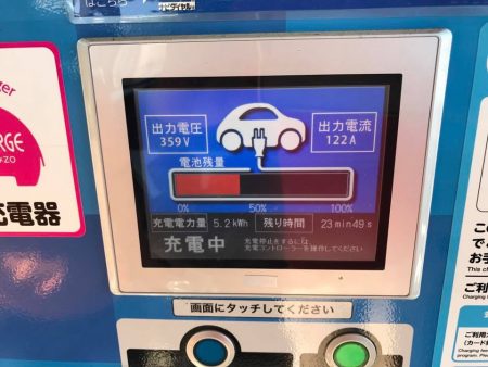心配なので緊急ピットインして急速充電を10分ほど。さすがバッテリー大きいだけあり、10分で10kWhも入った! リーフより10%以上速いです。30分の急速充電で30Aくらい入ると思っていい。ちなみにリーフだと18kWh程度。アウトランダーPHEVで9kWhくらいだ。