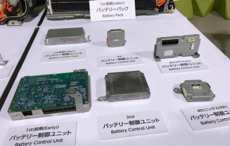 先日来「トヨタは電気自動車技術の中核技術を全て持っている」と書いてきたが、想像以上! 今回、初代プリウスから4代目プリウスの電動化技術を全て展示していた。下の写真はバッテリー制御ユニット。初代は左下。同じ機能を持つユニットが、右下の4代目でこんなサイズに!
