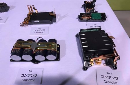 はたまた下はパワーコントロールユニットに使われているコンデンサー。これまた4代目になって驚くほど小さくなっている。その他、モーターも大幅に小型&軽量化している。希土類のネオジムの使用量は半分。ジスプロシウムに至っては96%も使用量を減らしているそうな。