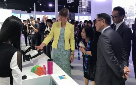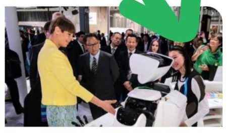 和田アキ子さん、じゃなかったエストニアの大統領が握手しているロボットの取材をしていたら(ちなみに皇室行事のTVで紹介されていた時は厳しい表情のカリユライド大統領だったが写真の通り極めてにこやかです)、ご一行様がやってきたので脱兎の如く場所を譲り面白がって写真を撮っていたら、どうやらこの時に向こう側からカリユライド大統領の側近も写真を撮っていたようだ。