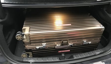 サイズはハードケースの中で最大級。BMW330eのトランクに入れたらこんな感じ。バッテリーを搭載している関係上、トランクの天地方向が少ないので1個しか入らない。しくしく。普通のクルマならギリギリで2個入るサイズをイメージして頂ければよかろう。参考までに書いておくと、アルミ製スーツケース本体の凹みについちゃ旅の勲章。アウツが蝶番壊れることです。