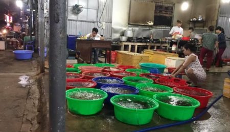 さて。私はアジアに行っても何だって食べる。現地の人が食べられるなら問題無い、という全く根拠の無い自信です。ただ生水は飲まず、歯磨きもミネラルウォーター使う。みなさん案外”うがい”とか水道水でしてるけどアブナイです。ということで今回も日本人は絶対行かないようなアブナイ店ばかり攻めてみた。下はダナンの地元の人ばかりいる海産物屋さん。美味しかった~!