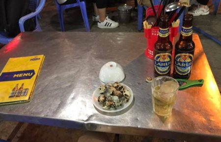 と思いきや、ビールに氷が。氷、アブナイんです。水道水を凍らしてる可能性ありますからね。こういった場所で出す氷でその国の衛生基準をイメージ出来る。まぁ大丈夫でしょう! ということで地面に置かれた怪しい金属バケツの氷を盛大に入れ、ビール飲む。ベトナムのビール価、超安い! この店だと1本50円! ビーチの海の家だと100円。ビール天国だ!
