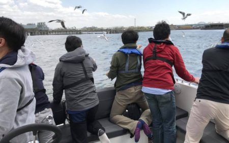 皆さん喜ぶのはユリカモメとの交流。日曜日もいつもの如くオトコブネ(女性が一人も乗っていない悲惨なフネのこと)だったのだけれど、イイ年したおっさん達もなぜか楽しそう。